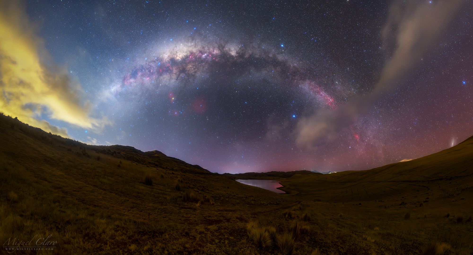 PT: A imagem revela o céu nocturno estrelado do Hemisfério Sul, captado a uma altitude de 4120 metros, acima da pequena lagoa de Qoricocha, no topo de uma das montanhas da região de Cusco, no Peru. O núcleo da Via Láctea era visível no alto a sudoeste, enquanto o Triângulo de Verão ascendia no sentido oposto. Não muito longe, perto do horizonte e imersa no brilho avermelhado do airglow, encontrava-se a nascer a galáxia de Andrómeda M31. Acima do núcleo da Via Láctea e ao longo da trajetória eclíptica que atravessa o Zénite, podemos encontrar o brilho ténue de um Gegenschein, visível no sentido oposto à nebulosidade colorida de Rho Ophiuchi.