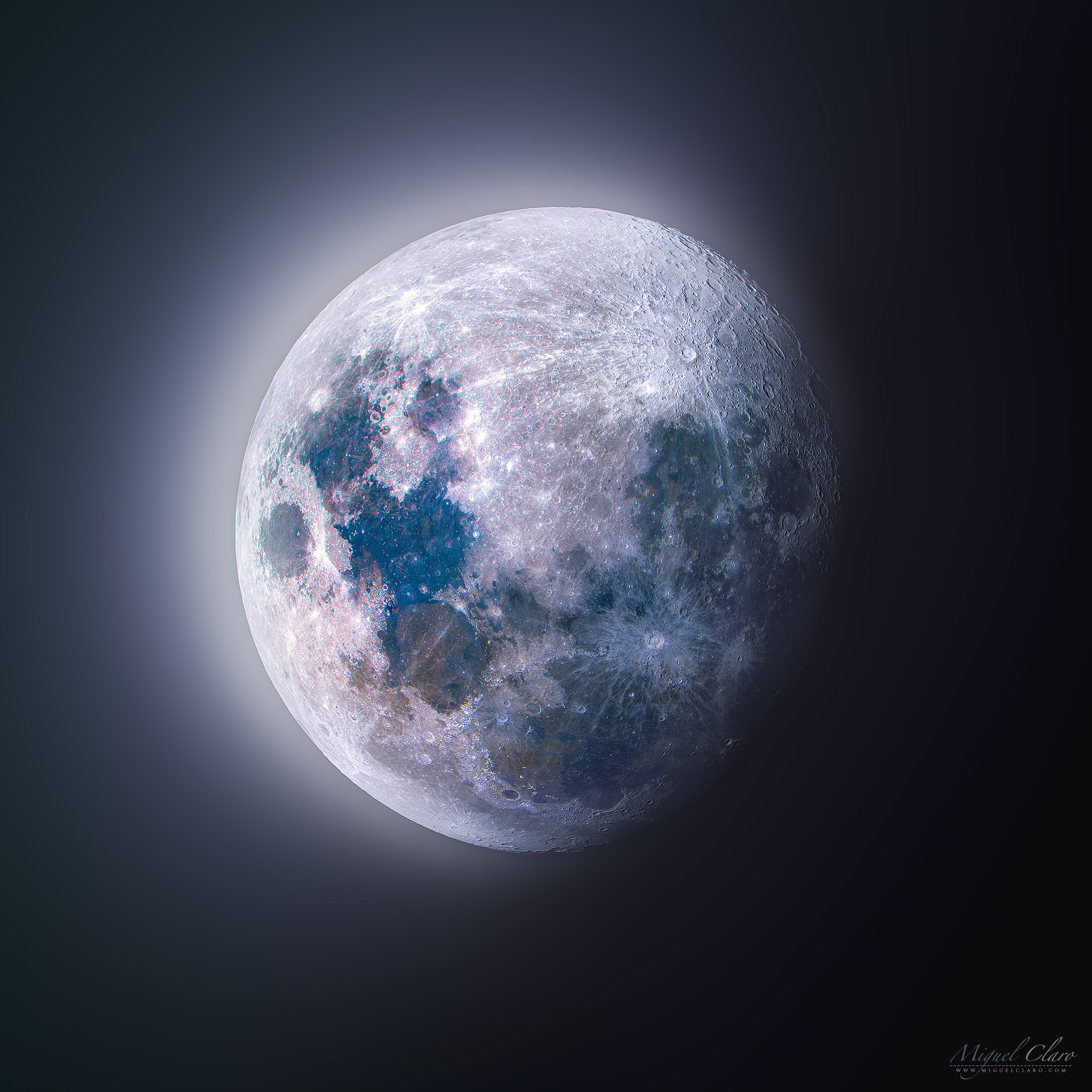 PT: Adoro a Lua e para celebrar o sucesso da missão Artemis II, decidi voltar à Lua e fotografá-la, revelando a beleza de uma Lua crescente gibosa numa cena HDR captada a 1 de março de 2026 com o novo Edge11 e uma câmara Poseidon-C Pro. A Lua é mais do que um corpo cinzento como normalmente a percebemos. A cor desta imagem RGB foi ligeiramente realçada, revelando um aspeto estranho, mas ainda assim real, que corresponde às diferenças na composição química da superfície lunar, uma vez que as alterações no conteúdo mineral podem produzir subtis diferenças de cor na luz refletida. Os tons azuis que podem ser observados em mares como o “Mare Tranquillitatis” ou o “Mare Fecunditatis” revelam áreas ricas em titânio. De acordo com o Hawai’s Institute of Geophysics and Planetology, a presença dessa camada incomum rica em titânio foi produzida pela cristalização de um enorme oceano de magma que cercou a Lua quando ela se formou. No centro da Lua, faixas esbranquiçadas espalham-se de forma raiada pelas terras altas lunares do sul, vindas da cratera Tycho, com 85 quilómetros de largura. No passado, imagens multi-coloridas calibradas por amostras de rochas das missões Apollo foram registadas pelas sondas espaciais Galileo e Celmentine e usadas para explorar a composição da superfície global da Lua.