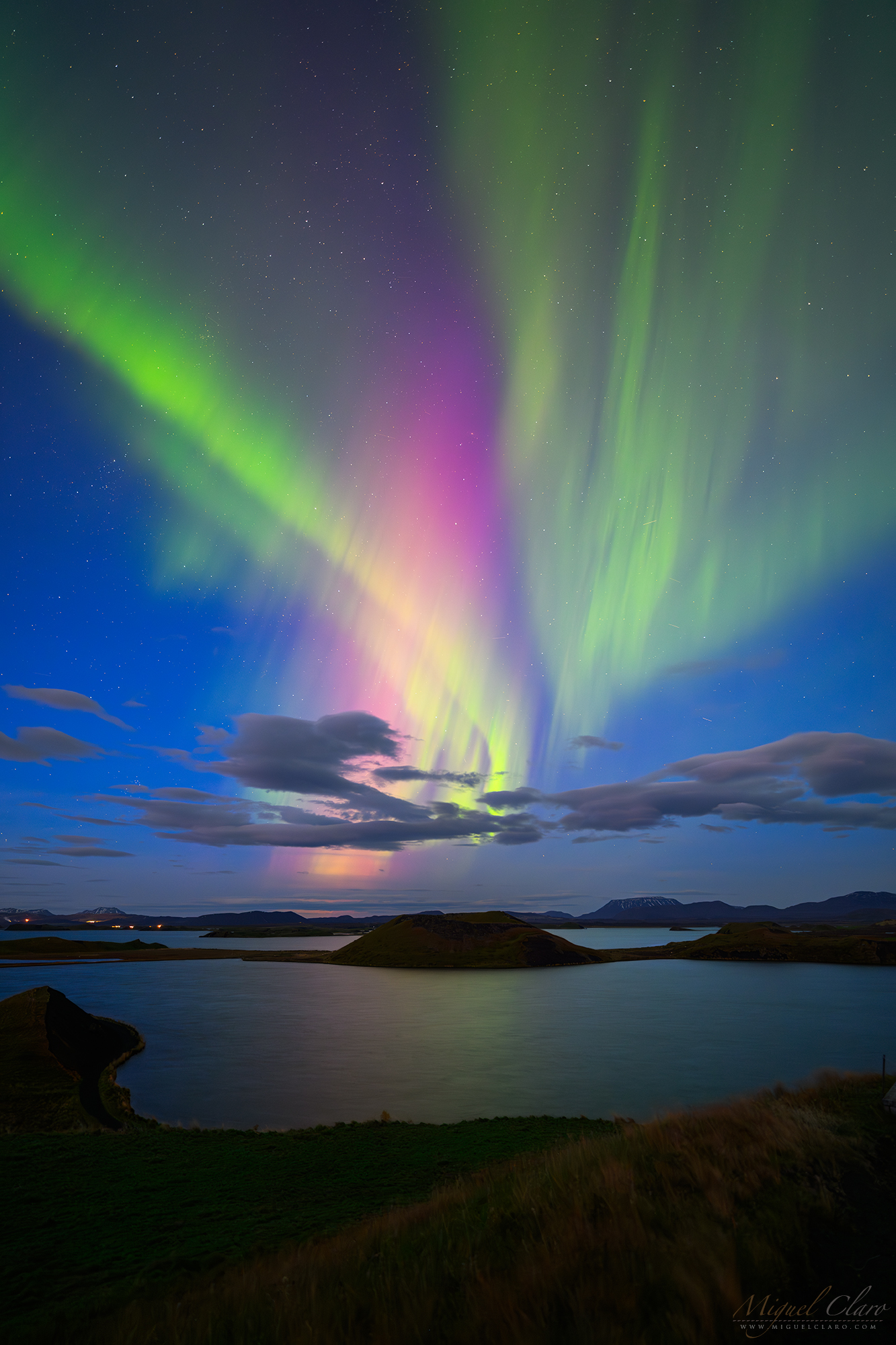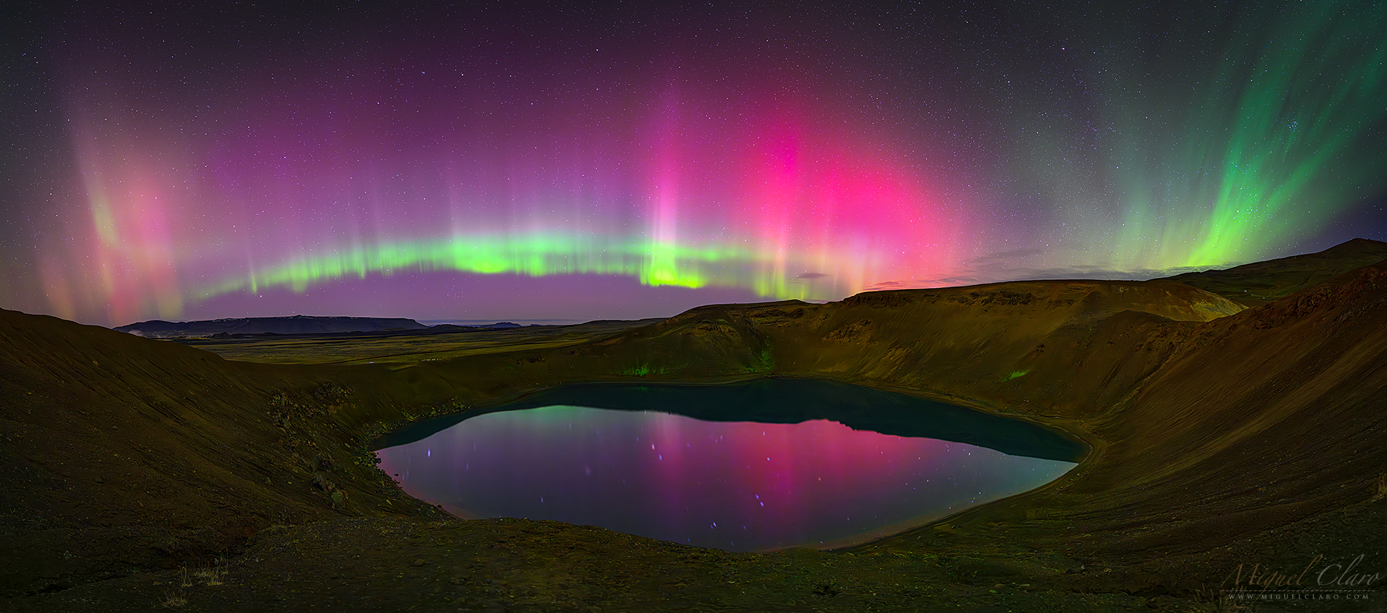 PT: Na minha longa viagem à Islândia, que decorreu em Setembro deste ano, encontrei na região de Krafla este lugar mágico com um lago embutido numa pequena montanha virada a norte. A vista do topo era impressionante e parecia uma cratera. No final da noite, as luzes do norte surgiram em todo o seu esplendor, enchendo o céu nocturno com maravilhosos tons avermelhados, entre violetas, rosas e ainda tons esverdeados, resultado das partículas carregadas proveneientes do sol em interação com diferentes elementos na alta atmosfera.