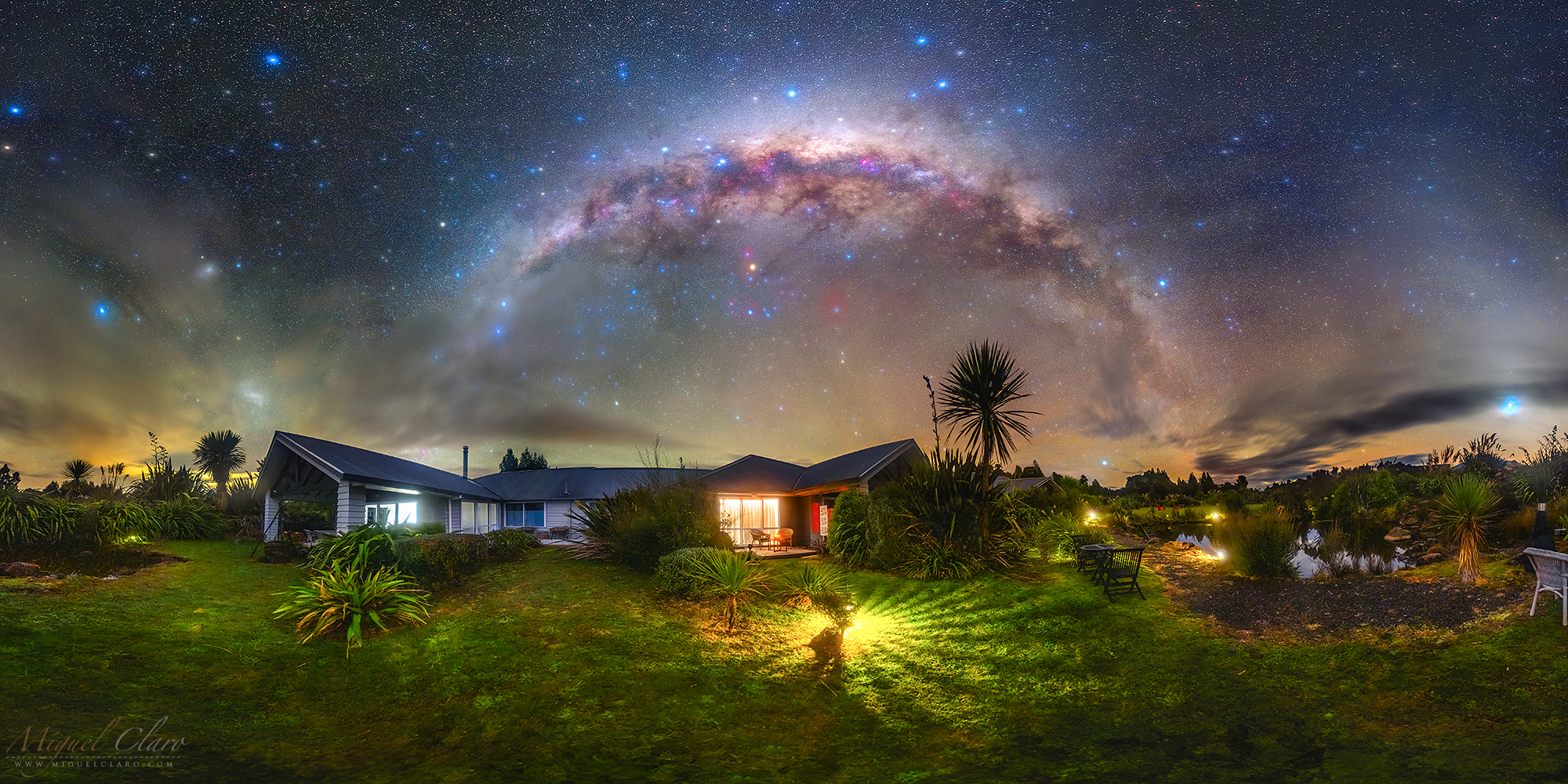 PT: A imagem revela o céu estrelado do Hemisfério Sul, captado a partir das Tongariro Suites, um incrível alojamento de luxo localizado no Parque Nacional de Tongariro, na Nova Zelândia. A foto foi tirada em maio de 2025, quando o tempo estava um pouco instável, mas tive a sorte de conseguir captar todo o mosaico do céu antes de ficar totalmente coberto por uma camada de nuvens. Com o núcleo da Via Láctea a tocar no zénite e repleto de nebulosas avermelhadas provenientes da emissão de H-alfa, mais abaixo, à esquerda e por entre as nuvens passageiras, a Grande e Pequena Nuvém de Magalhães, brilham intensamente, companheiras satélite da nossa Via Láctea. No sentido oposto, no extremo direito deste amplo panorama, o planeta Vénus revelava uma coroa azulada através de uma fina camada de nuvens que refractava a sua luz. Seguindo o brilho venusiano para cima, avista-se a ténue luz do plano zodiacal. A constelação de Escorpião e a colorida nebulosidade de Rho Ophiuchi dominam a cena central por baixo do arco da Via Láctea.